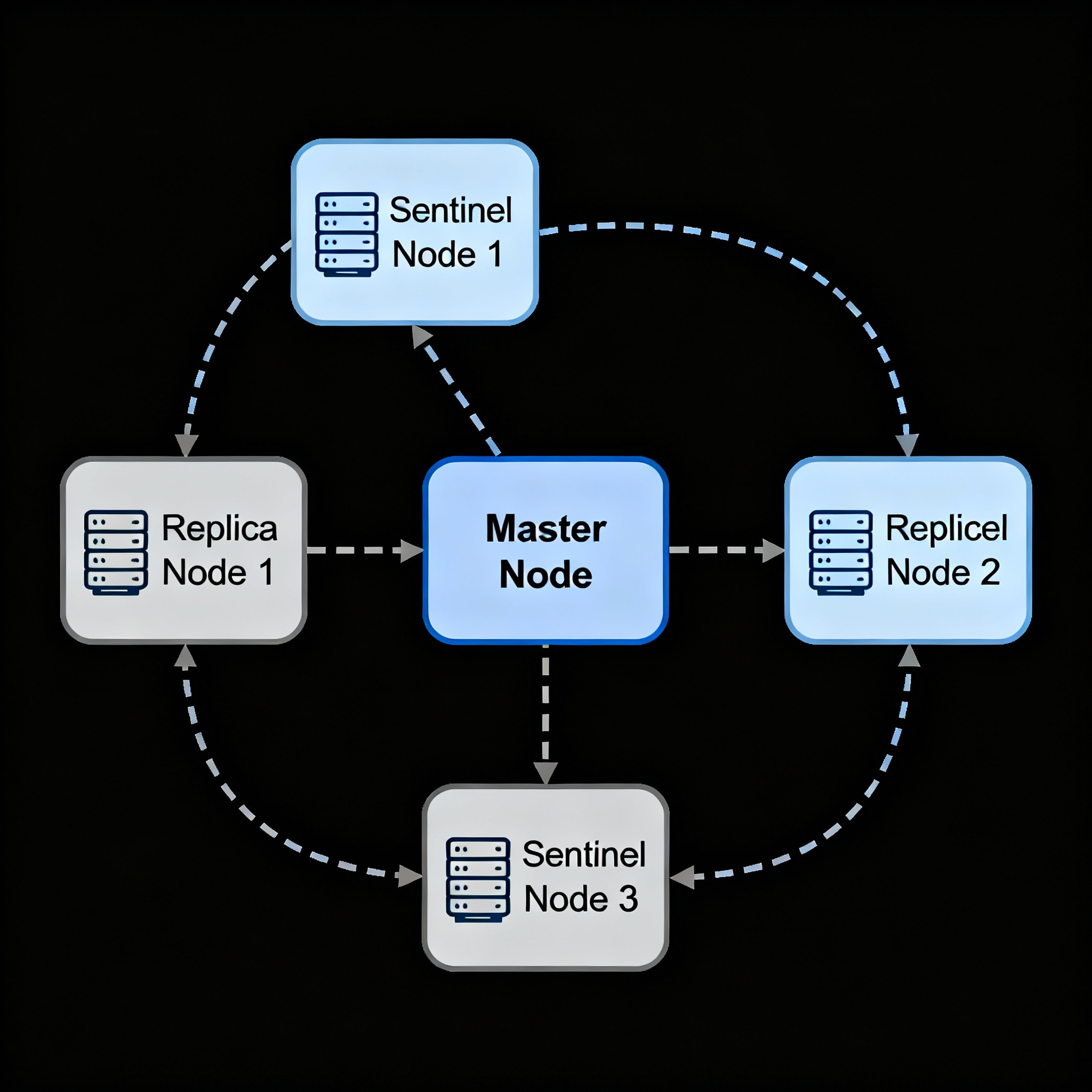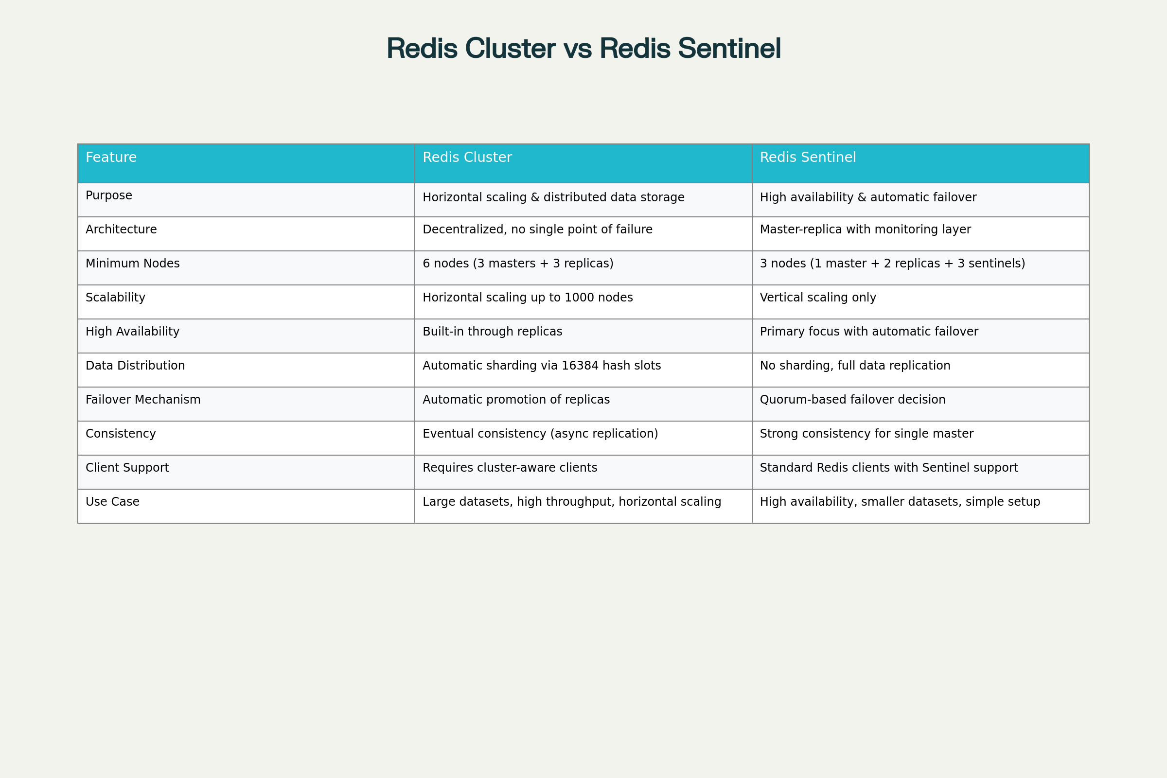 Redis Sentinel provides very high availability without human intervention. Even if all replica nodes fail, the system can continue operating with just the master node, though this reduces redundancy. system-design-redis-sentinel-vs-cluster-pros-and-cons